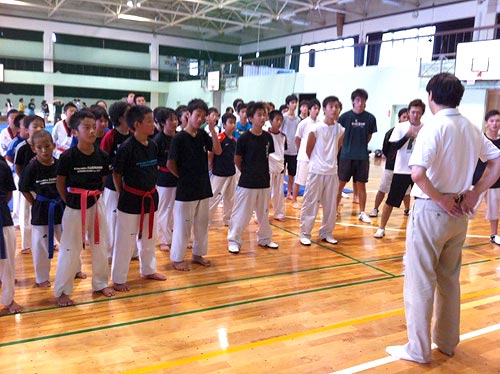 午前中に体力訓練、午後はミット蹴り、キョルギ中心のメニューで行われ、真夏の体育館の熱気の中、参加者は、暑さと戦いながら、ハードな練習に挑んでいた。
