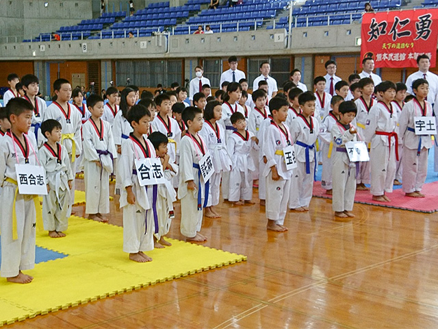 団体プンセは託麻道場が制し、注目のキョルギ団体戦は合志道場Aと宇土道場Bの対戦となり、先鋒の芋生(合志)対荒木(宇土)は、1ラウンドでは勝負がつかずサドンデス(1ポイント先取)となり、芋生が個人戦準優勝の意地を見せ8-6で勝利続く、中堅は3.4年重量級優勝の田尻(合志)と、3.4年軽量級優勝の野口(宇土)の対戦となり、田尻が4-2で競り勝ちこの時点で2連勝の合志道場Aの勝利は確定したが、最後の大将戦も5.6年重量級優勝の眞弓(合志)と、5.6年軽量級優勝の山谷(宇土)の対戦は、スピードを生かした山谷の攻撃で接戦となったが、最後は眞弓が6-5で逃げ切り3戦全勝で嬉しい初優勝となった。